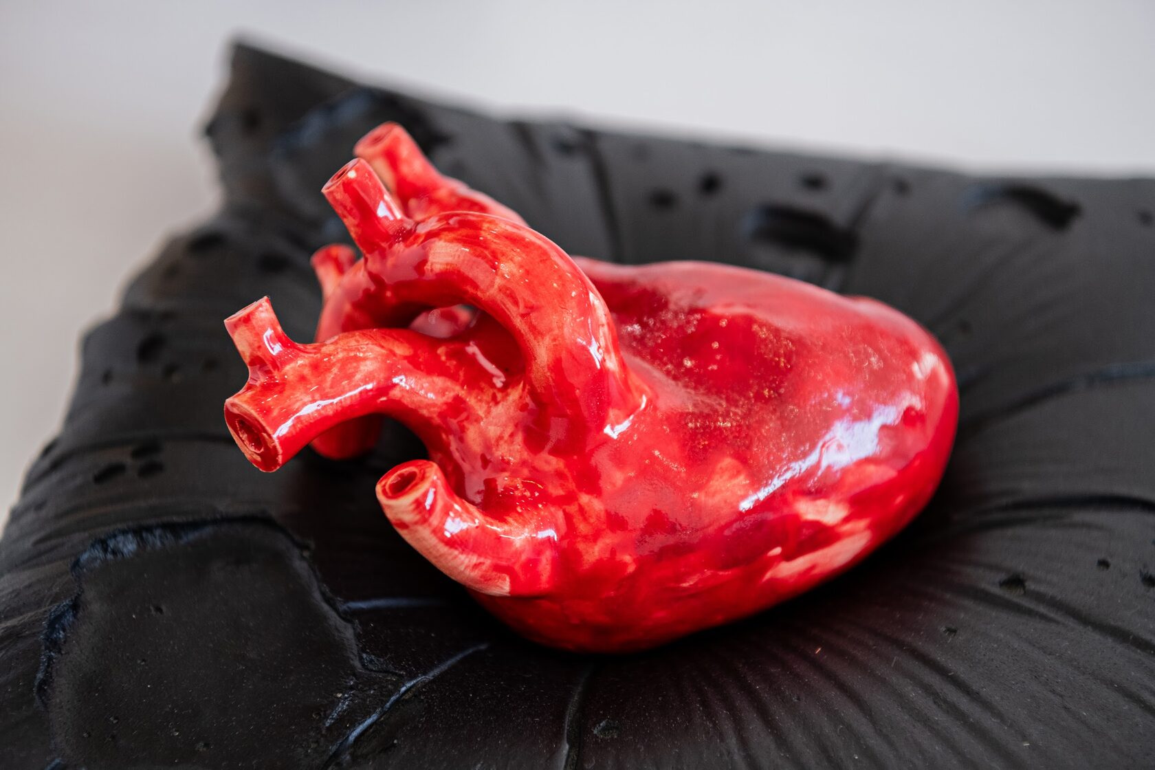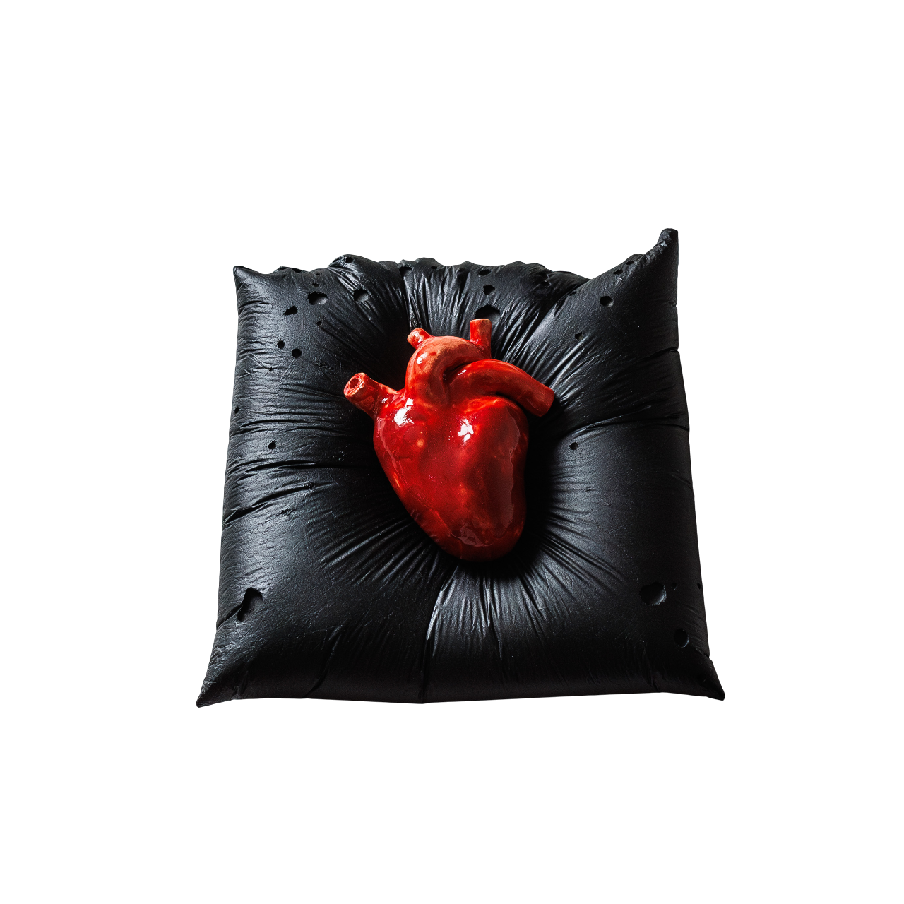 Работа «Эпикриз» — это мощный скульптурный statement о конечной цене власти. Она представляет собой анатомически точное, ярко окрашенное, витальное «сердце» из хрупкой керамики, покоящееся на тяжелой, холодной бетонной «подушке».